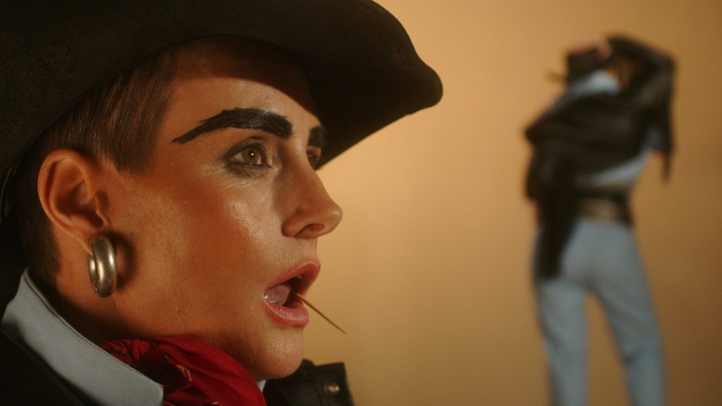 This might be the thing about The Creep for people who have this response of: “Oh, my God, The Creep is repulsive, but I also kinda wanna have sex with them.” Because being funny is hot. And it’s a slipperiness: is The Creep inherently funny? Or is our gaze making them funny? Are they a joker or are they a joke? You know, what does that distance do to them and how we understand them? Do we know them, or get them, or not? Like with the shoot-out sequence, as a pastiche of the Sergio Leone cinematic language, I wanted to make a clear choreographic motif of ‘conjuring of the invisible weapon’. You know, the fingers twitching, summoning at the hips, but there is in fact no weapon there. Like in classic Greek theater – the graphic violence is left outside of representation, it’s left to the imagination of the audience – which can produce infinite possibilities of horror. It’s also kind of a joke that the weapon inevitably doesn’t exist—like the punchline, the gag, is: maaaybe it’s the threat of projection that harms us?