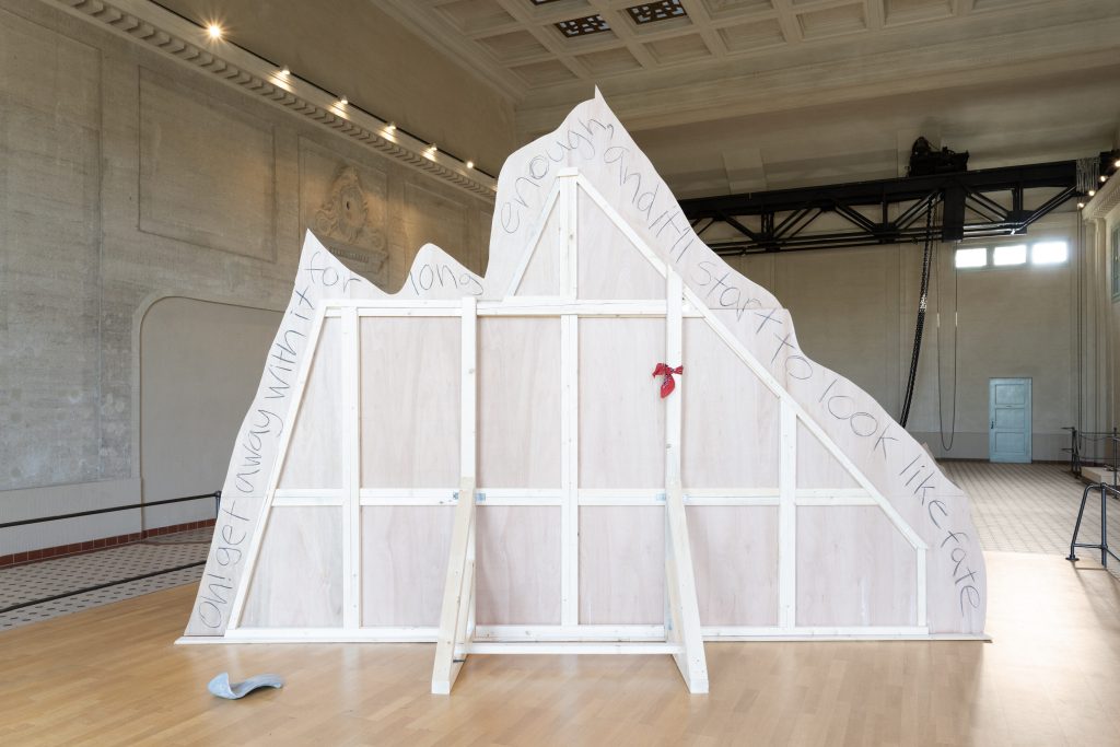 The mountains of the exhibition are another kind of visual gag on one level – they are a riff on theater flats, or the kind of Roadrunner/Wyle E. Coyote cartoon prop as an illusion of danger. The mountains in the exhibition are perhaps the briefest gesture that can be recognizable as a mountain – a quick line drawing: and as you approach the big one, it’s this – albeit two-dimensional – white, towering mountain. Then as you come to the side, you see just how incredibly thin it is. I think a joke is often a revelation – to be delighted by the discovery of something being shifty in its shape, by having a punchline, a plot twist, a big reveal – and this becomes a further seduction into the work. The aperture of wanting to engage widens receptivity and I think this is the thing: humor increases receptivity to what else I might want to talk about seriously in both subtle and obvious ways.