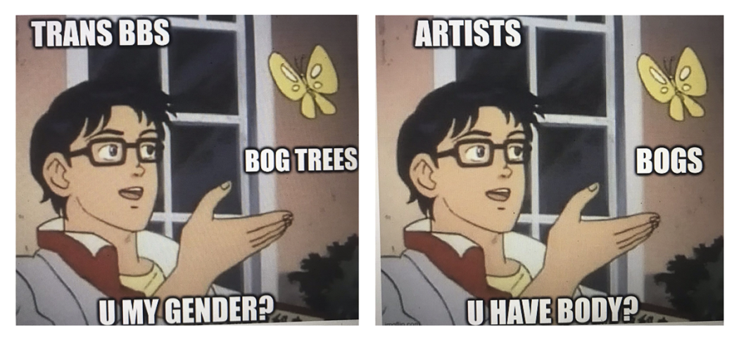 Two memes featuring an animated person with short dark hair gesturing at a yellow butterfly. On the left, the meme labels the person "trans bbs" and the butterfly "bog trees", with the bottom caption reading "U my gender?" On the right, the same image labels the person "artists" and the butterfly "bogs" with the caption reading "U have body?"