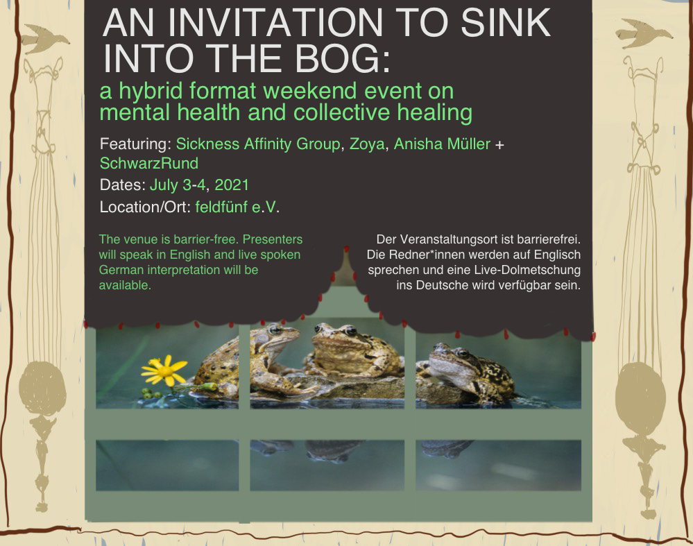 Dieses Wochenende ist eine Einladung mit uns im Sumpf zu versinken und gemeinsam zu regenerieren, in Präsenz und online. Wir veranstalten ein Wochenende, welches der gemeinschaftlichen Heilung gewidmet ist. Zu den Themen gehört der Schnittpunkt zwischen Kunst und chronischer Krankheite, das Navigieren durch die weiße, rassistische Gesundheitsindustrie und Mittel zur Bewältigung von Traumata, die aus dem Erlebten der queeren Gemeinschaft stammen.