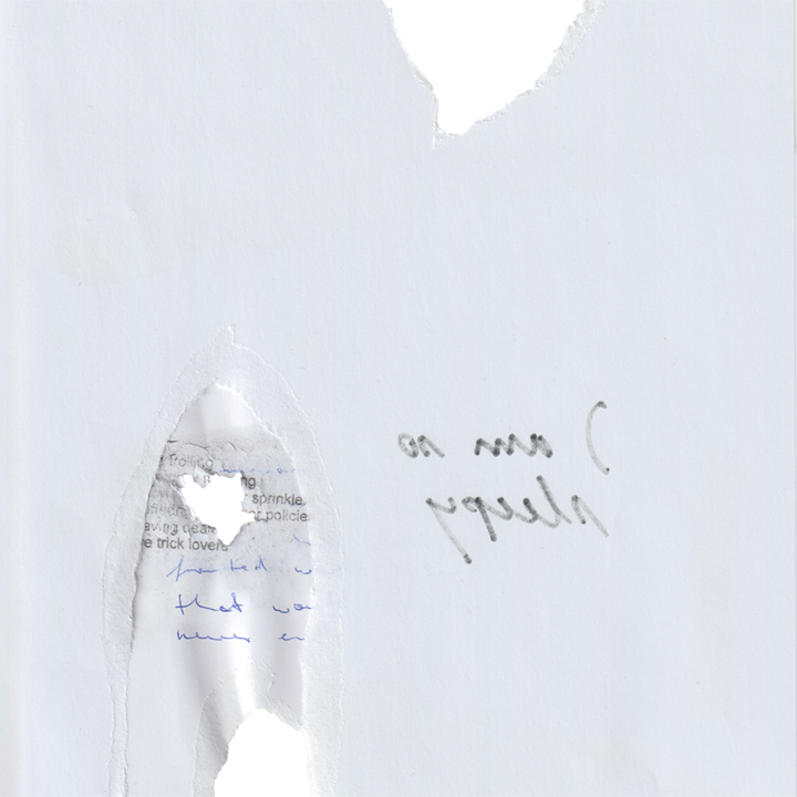 A multilayered collage of abstract paper cut outs on a transparent background. There’s handwritten text on the pages, which is unreadable, because it is mirrored.