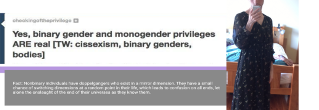 tumblr post reading "Yes, binary gender and monogender privileges ARE real (TW: Cissexism, binary genders, bodies)"