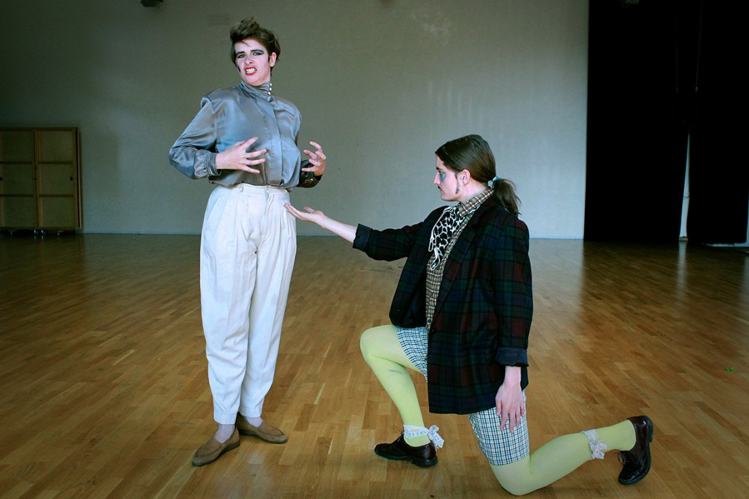 S: Yeah, and this is something I’m interested in in what we’re doing. And it also manifests itself physically. I think [touch] is a very feminine principle to work with. It’s what makes our work not so stereotypically drag-king based. This [stereotype] is something we are constantly trying to walk away from, as in not working with mime or not working in these very clear performance strategies that we see being re-adapted within the showing room.