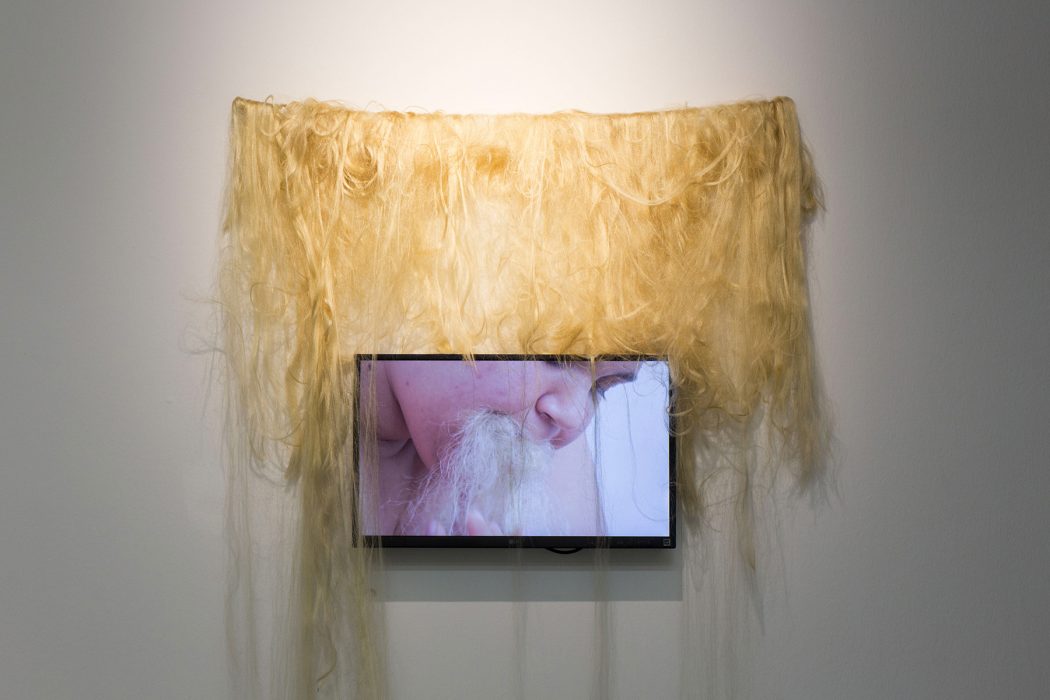 The other week, nicola awang was kind enough to schlep her computer to a cafe and let me record a conversation we had about ‘refahmation’, her video installation piece currently on view as part of LUCKY. Made in 2016, ‘refahmation’ is their directorial debut featuring two black women, white supremacy, and self love. At first the women furiously eat a pile of blonde extensions set in front of them, but ultimately abandon it, and begin engaging with one another, each other’s hair, and themselves, with deliberate and affectionate touch. In LUCKY, nicola’s silent film is mounted beneath a banner of blonde that bleeds out onto the floor where a big amorphous pile of blonde hair extensions lie, inviting visitors to interact with it.