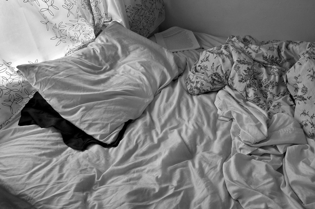 A black and white image of a rumpled bed with white sheets and a floral duvet thrown to the side. The white pillow has another darker pillow peeking out from underneath, and a bright window is behind the bed. The wrinkle pattern in the fabric is most heavily emphasized. A paper with text printed on it is on the far corner of the bed.