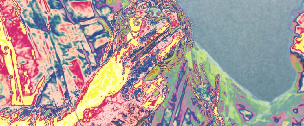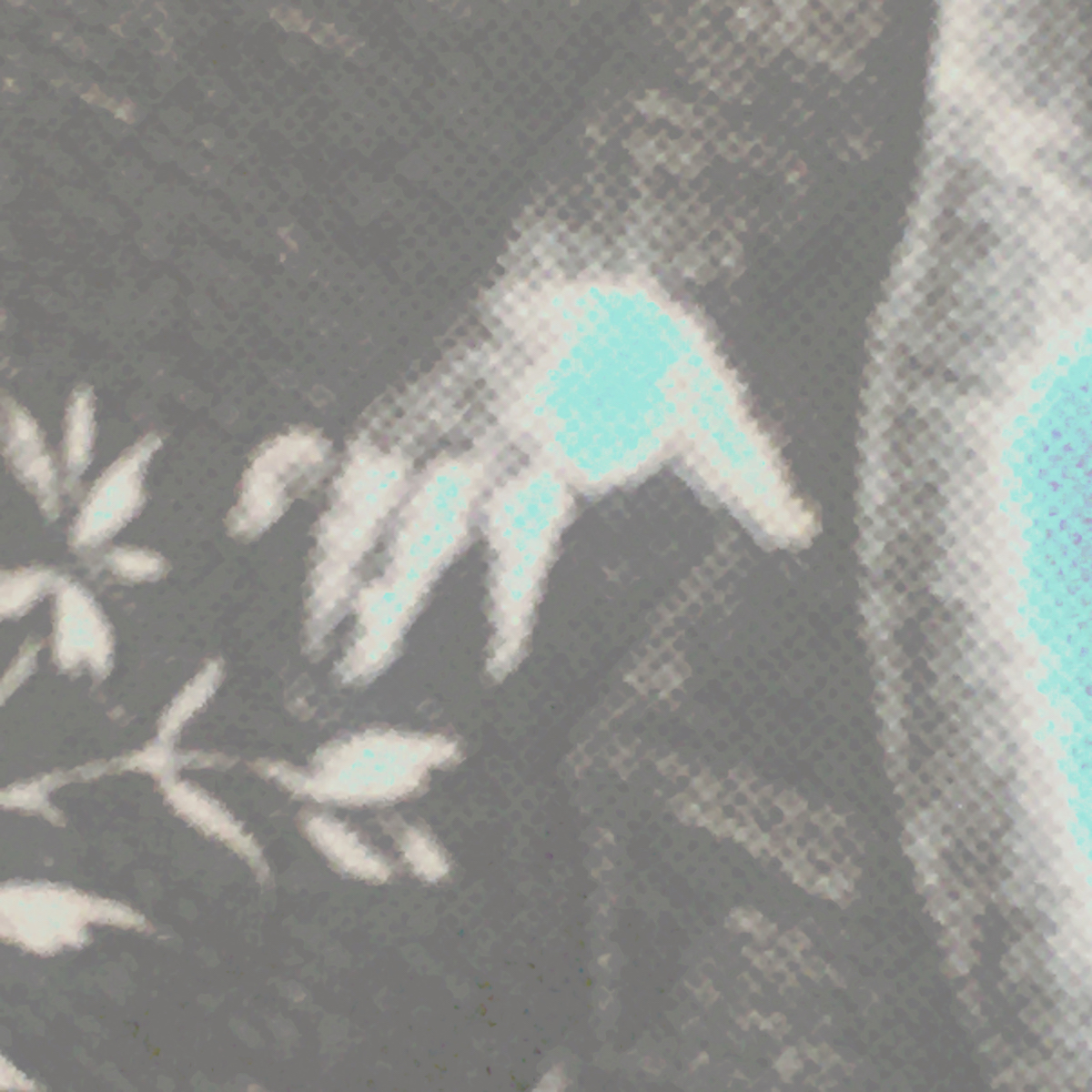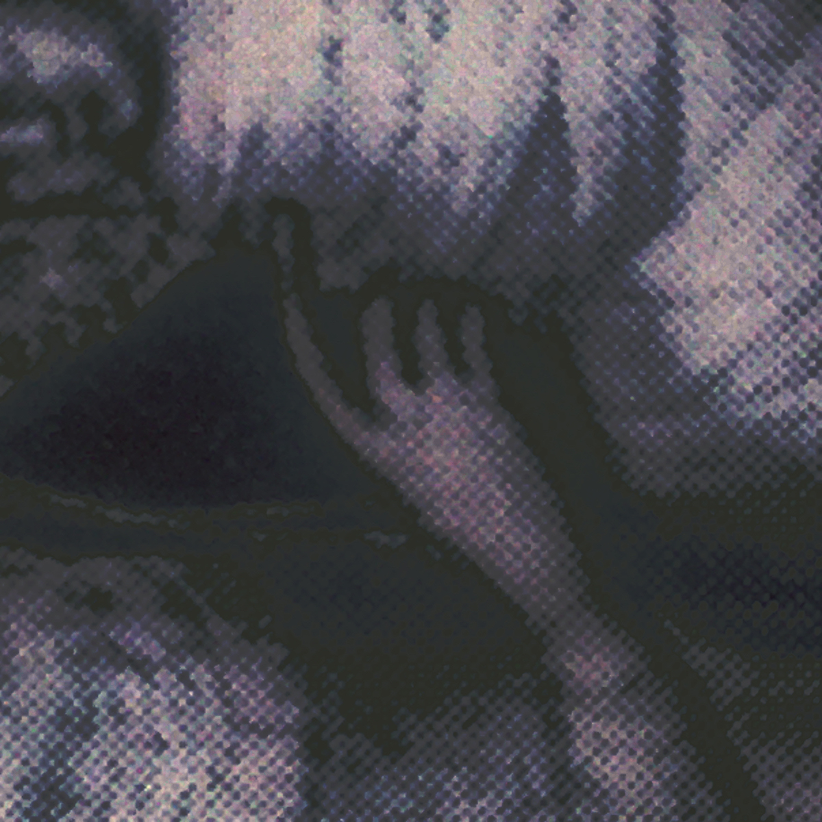 A color edited image of a clergyperson or other person wearing an ornate robe holding an object. The image is centered on the robe and hand.