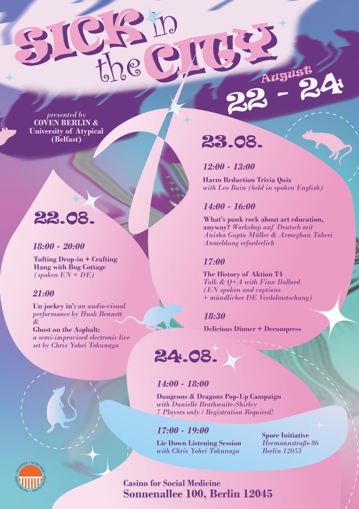 SICK IN THE CITY is a weekend event series to showcase three years of collaborative research and artistic exchange between us, your humble queer feminist art and curatorial collective, COVEN BERLIN, and University of Atypical, an art institution by and for d/Deaf, disabled, and neurodivergent artists and cultural workers in Belfast. Our work together centers on how we can approach the art world with access in mind in a way that identifies physical barriers to participation, as well as the barriers that racism, classism, ableism, xenophobia, homophobia, and transphobia present, among others.