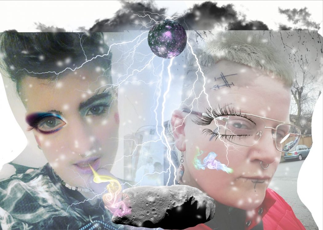 Two faces with a disco ball, stars, lightening, and futuristic elements